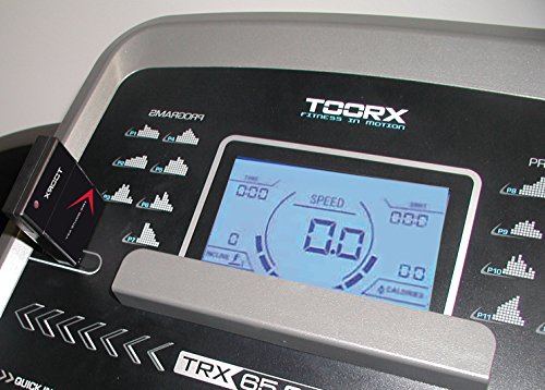 Torna nella sua nuovissima linea il tapis roulant Toorx TRX 65 S, dal design molto più curato e innovativo, con delle funzionalità nuove, come il bluetooth. Il TRX 65 S ha un motore da 2,75 CHP di potenza continua con un picco massimo di 3,75 Hp. La vel Il Toorx TRX 65 S è un modello App Ready, con sistema bluetooth intelligente che consente di usufruire delle App più motivanti e divertenti specifiche per l'alenamento con il tapis roulant. Si potranno scaricare queste app gratuite acquistando separatame Nella console sono presenti i tasti per la selezione rapida della velocità ( 3 / 6 / 9 / 12 km/h ) e dell'inclinazione ( 3 / 6 / 9 / 12 % ). Programmi preimpostati 15 Preimpostati + 3 USER + 3 HRC + 1 Body fat tester + 1 manuale + Bluetooth Dimensioni Aperto 185 x 75 x 146 cm Dimensioni chiuso 115 x 75 x 165 cm - Portata Max Kg 120
