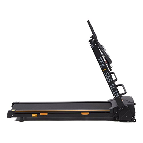TFK 555 Slim di Everfit è uno dei nuovi prodotti della linea salva-spazio di Everfit. Dotato di tutti i comfort, TFK 555 Slim, è un tapis roulant compatto che in posizione di chiusura arriva a misurare meno di cm 26.00 di spessore dal pavimento. Il nuovissimo sistema di apertura/chiusura facilitata di TFK 555 vi permetterà di allenarvi sul tapis roulant e di richiuderlo in pochi istanti, in totale comfort e sicurezza, senza necessità di utilizzare alcun attrezzo.